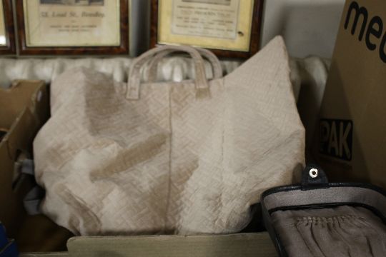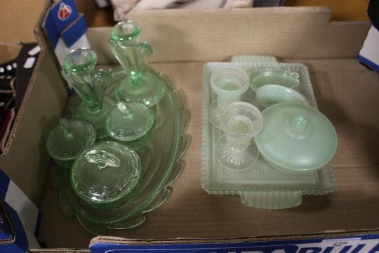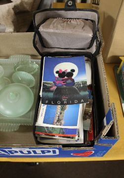 TWO GREEN GLASS DRESSING TABLE SETS, A QUANTITY OF POSTCARDS AND SOME SHOPPING BAGS