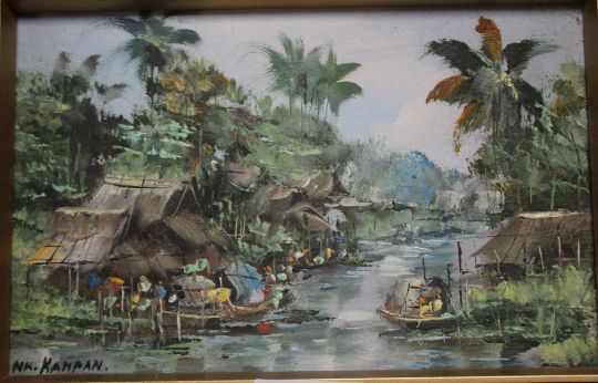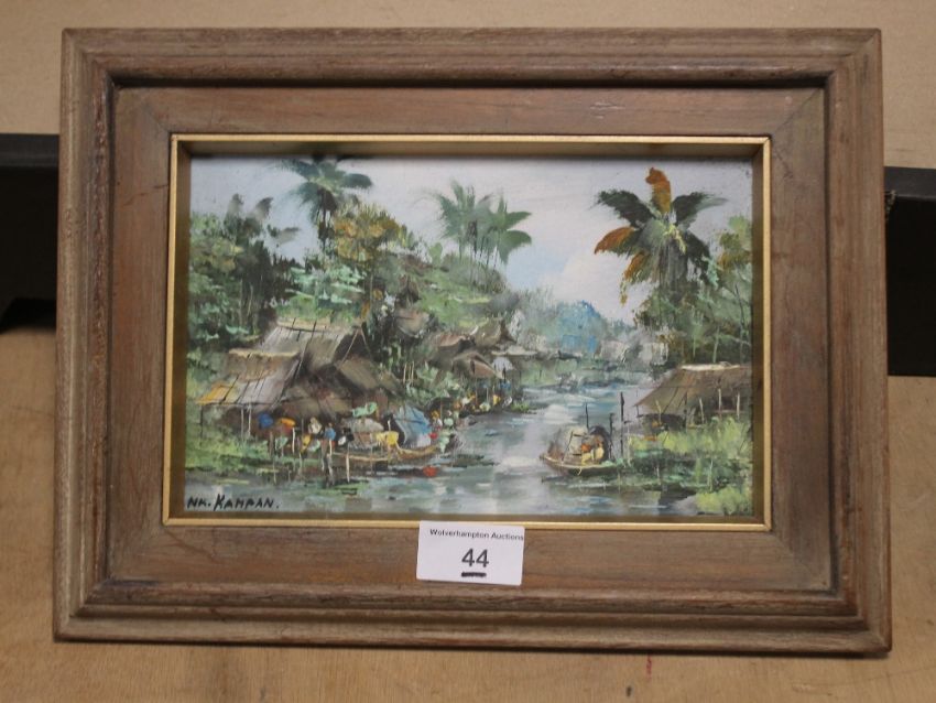 N. K. KAMPAN - A FRAMED OIL ON BOARD DEPICTING A FAR EASTERN RIVER SCENE, 31 X 23 CM