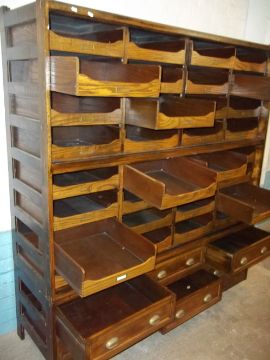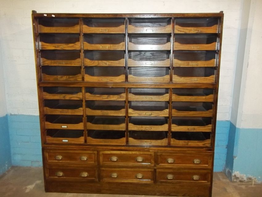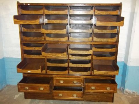 AN ANTIQUE OAK HABERDASHERY UNIT CUPBOARD, 180 CM WIDE