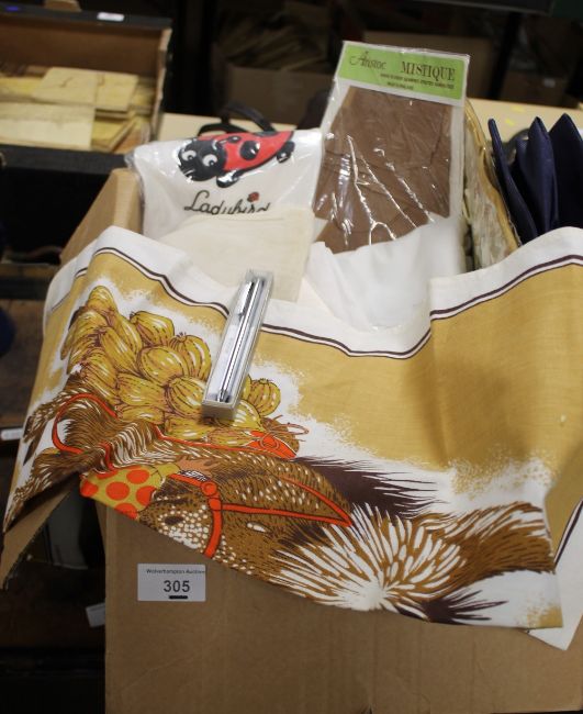A BOX OF LINEN TO INCLUDE WOOLWORTHS LADYBIRD T-SHIRT, ARISTOC STOCKINGS, A RETRO TEATOWEL AND A BOXED CHROMATIC PEN