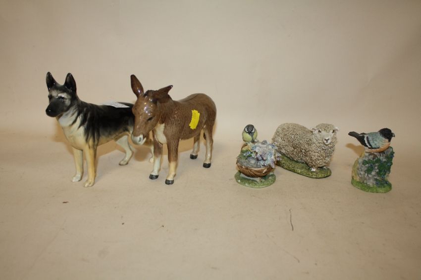 A BESWICK DONKEY AND BESWICK ALSATIAN FIGURE PLUS THREE OTHER FIGURES (5)