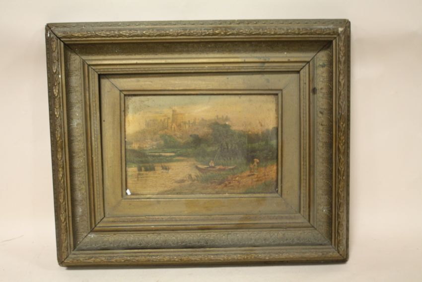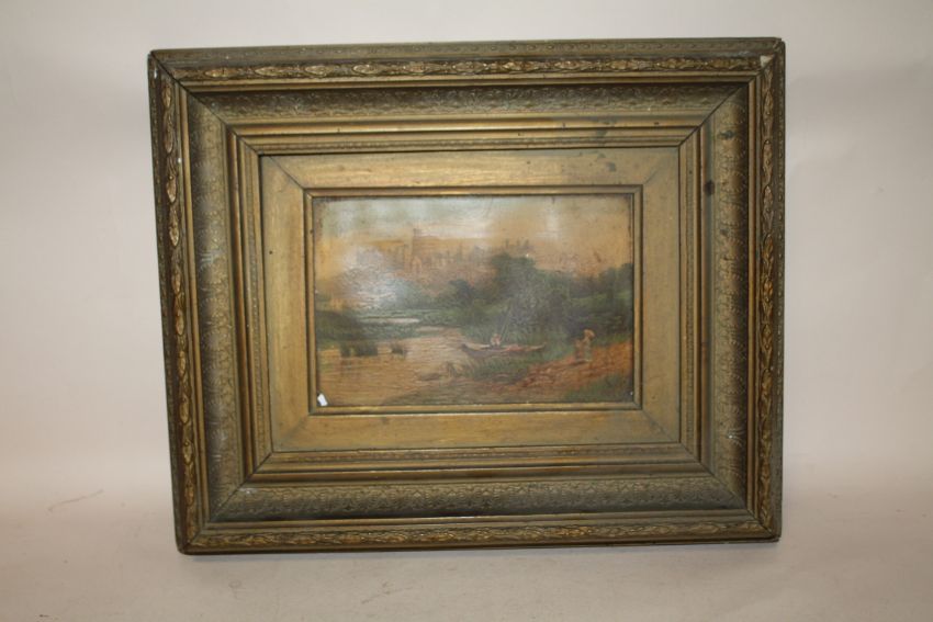 AN ANTIQUE GILT FRAMED OIL ON CANVAS OF A RURAL RIVER SCENE SIZE - 24CM X 16CM