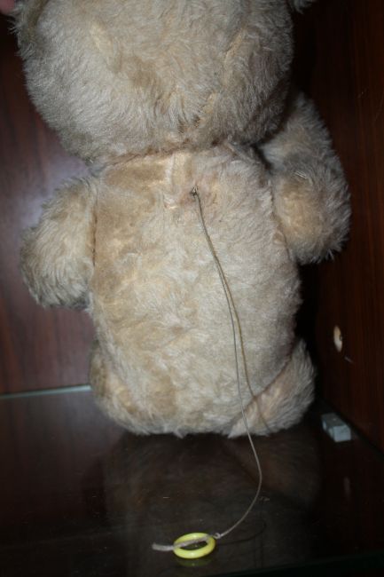 A VINTAGE JOINTED TEDDY BEAR WITH GLASS EYES AND PULL STRING