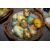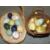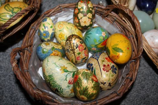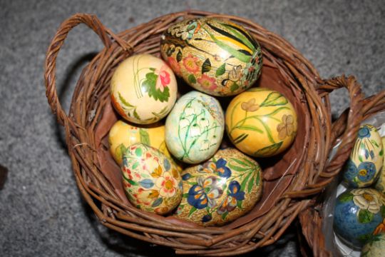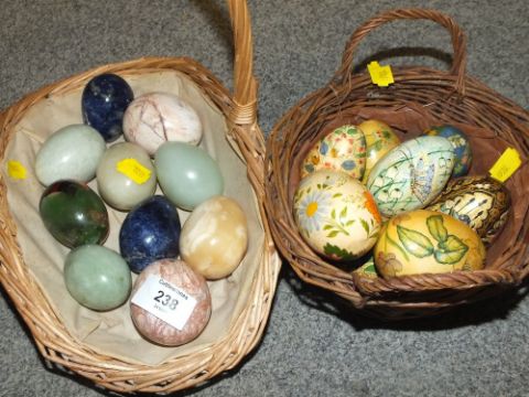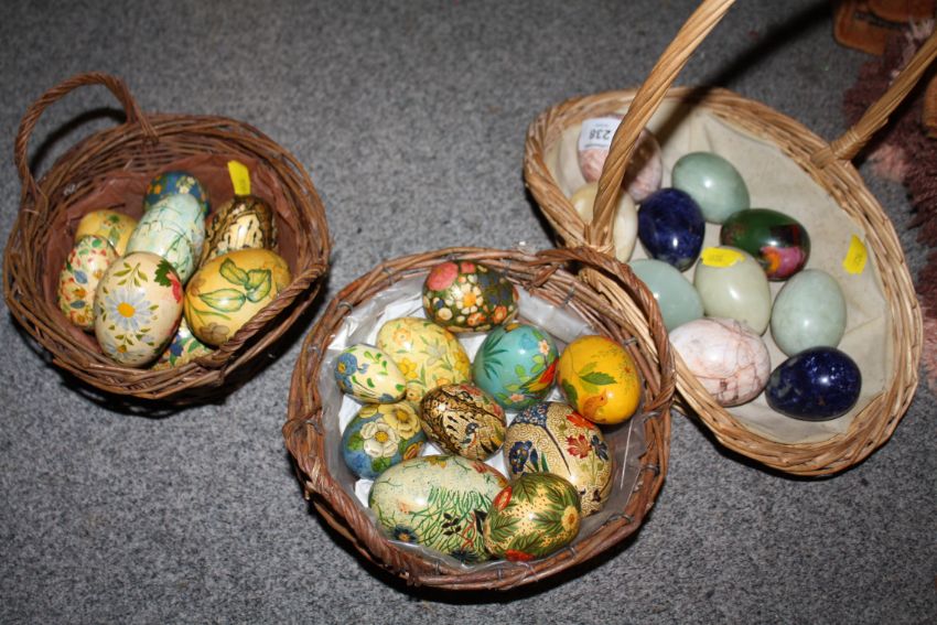 A BASKET OF POLISHED HARD STONE EGGS TOGETHER WITH TWO BASKETS OF HAND PAINTED WOODEN EGGS