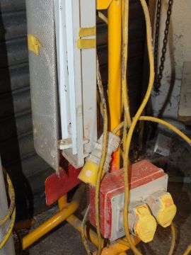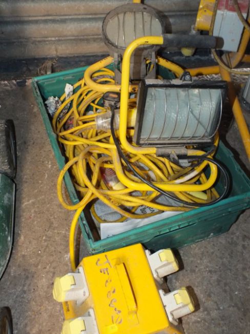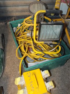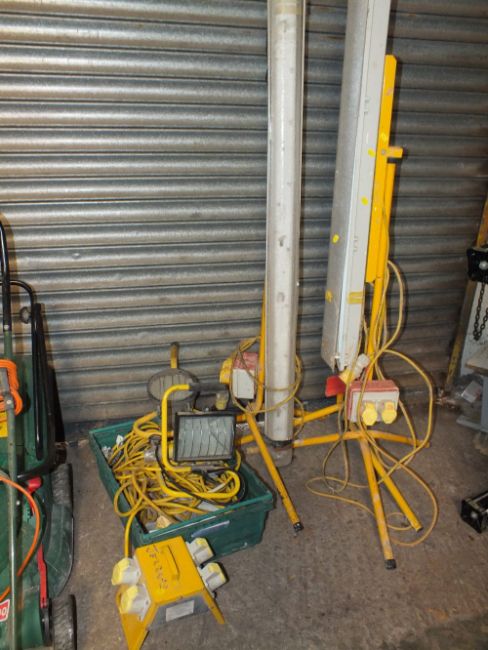 TWO LARGE WORK LIGHTS ON TRIPODS TOGETHER WITH TWO SMALLER EXAMPLE, QUANTITY OF CABLE ETC - HOUSE CLEARANCE ALL A/F