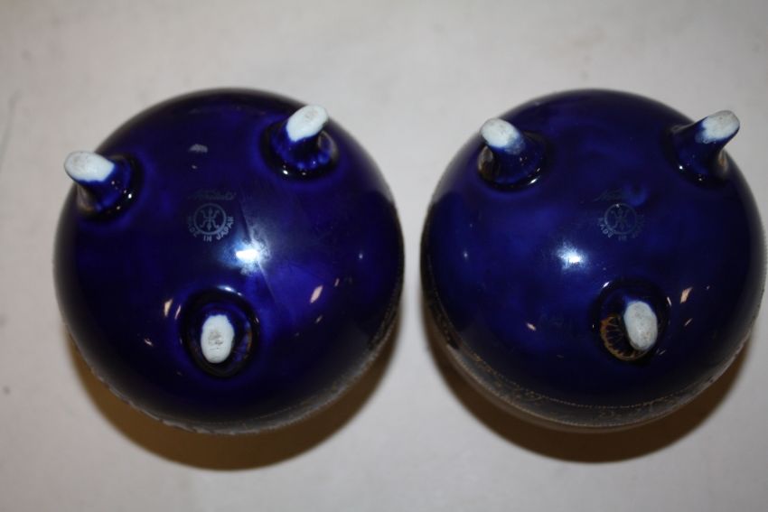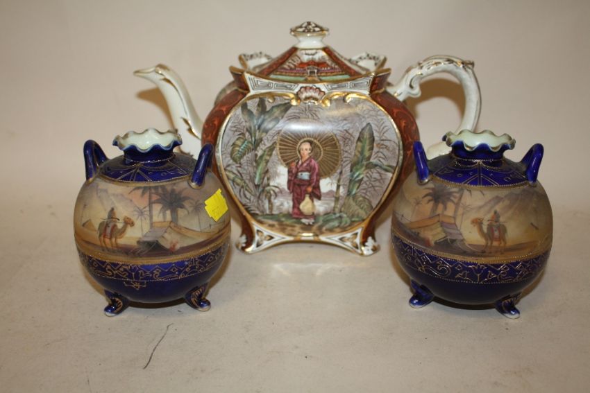 A PAIR OF NORITAKE TWIN HANDLED HAND PAINTED VASES TOGETHER WITH AN ANTIQUE TEA POT