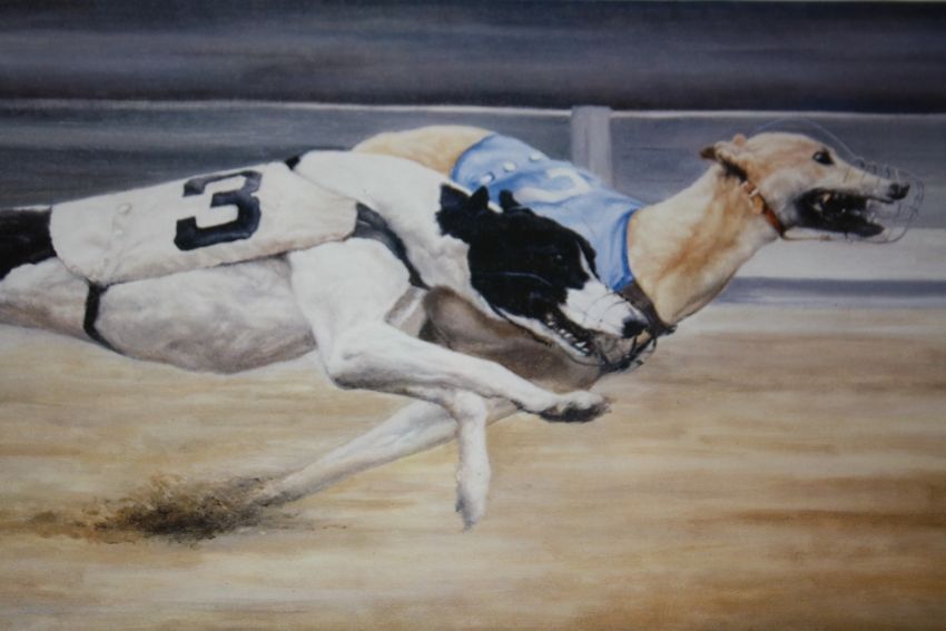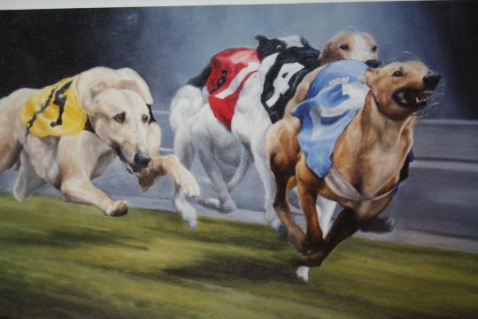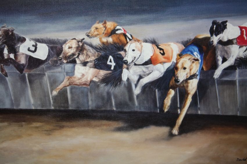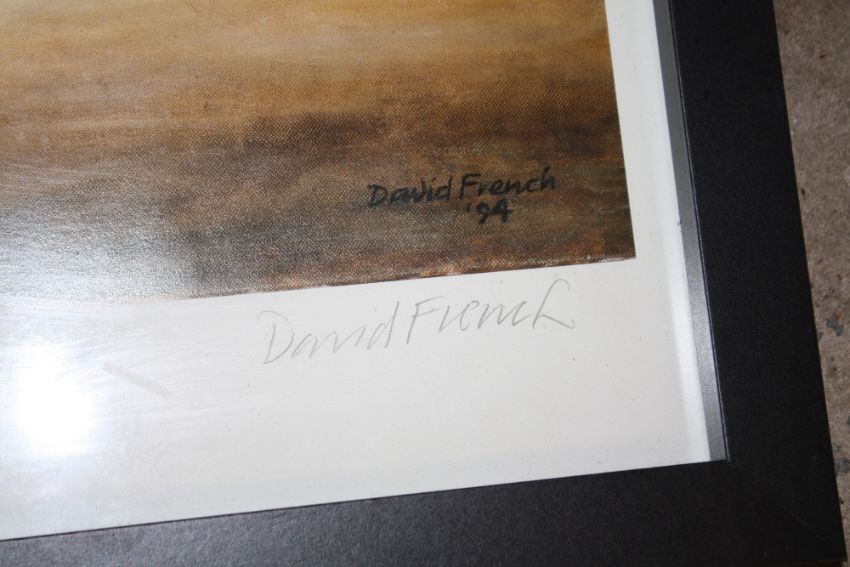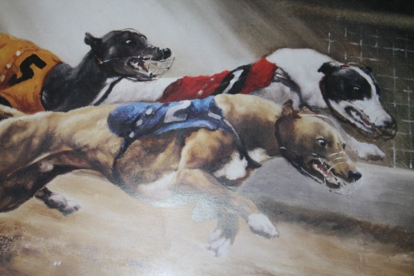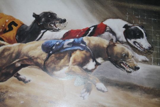 A SET OF FOUR FRAMED AND GLAZED SIGNED GREYHOUND RACING INTEREST PRINTS BY DAVID FRENCH OVERALL SIZE INCLUDING FRAMES - 55CM X 45CM