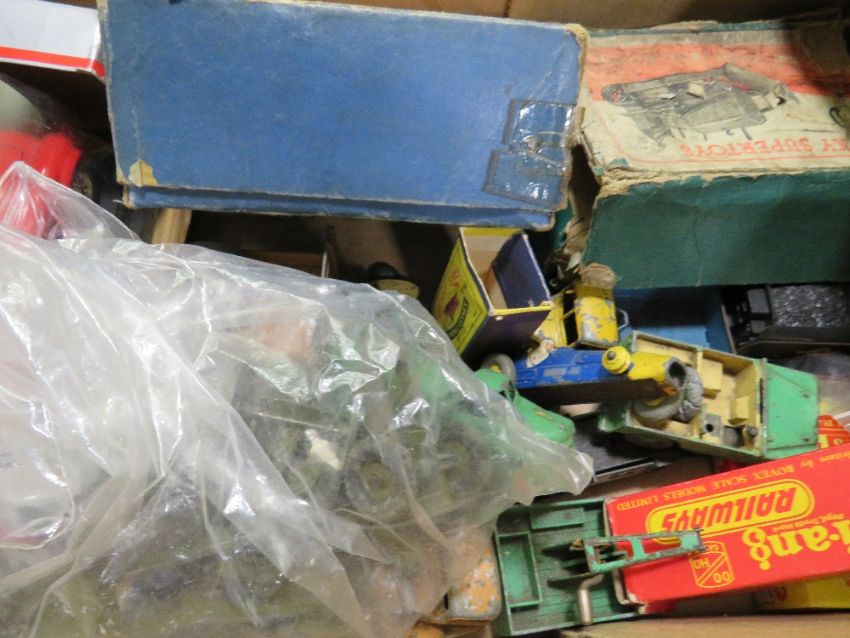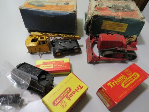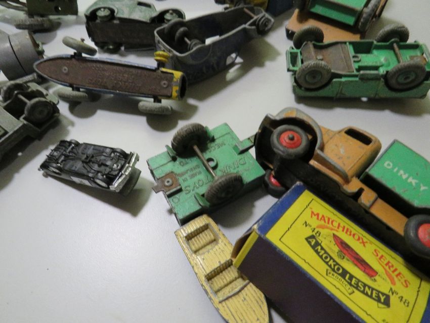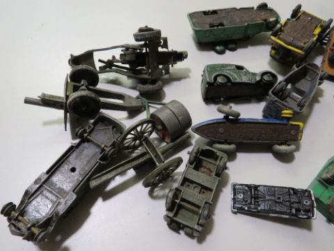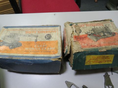 A QUANTITY OF VINTAGE DIECAST VEHICLES TO INCLUDE A DINKY BLAW KNOX BULLDOZER AND COLES MOBILE CRANE - BOTH BOXED A/F, A SELECTION OF MILITARY VEHICLES AND SMALL SELECTION OF TRIANG ETC