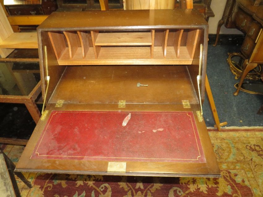 AN OAK BUREAU W-76 CM WITH A PIANO STOOL AND TROLLEY
