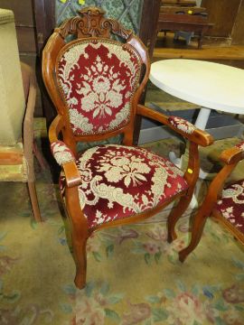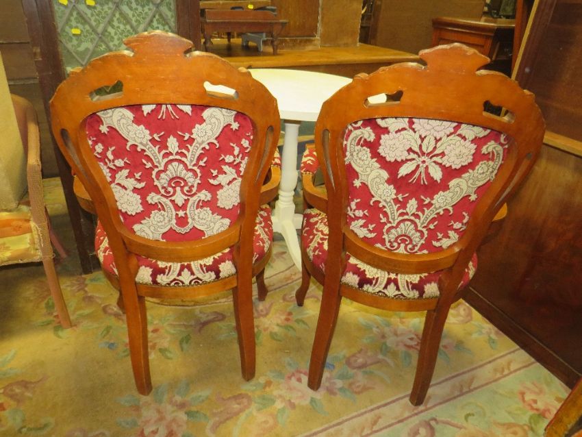 A PAIR OF MODERN CARVED ARMCHAIRS AND A WHITE PEDESTAL TABLE (3)