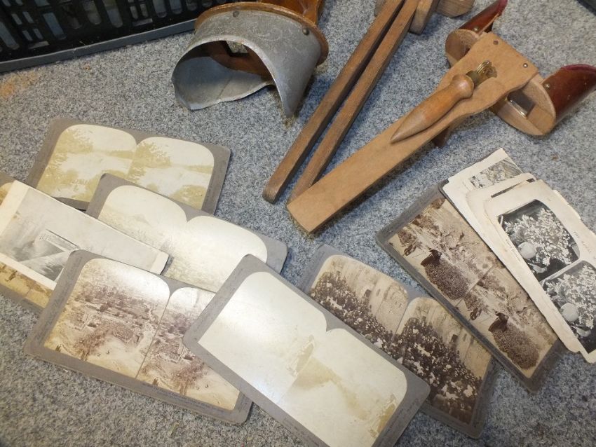 A TRAY OF METALWARE AND GLASS BOTTLES TOGETHER WITH TWO VINTAGE PHOTOGRAPH VIEWERS