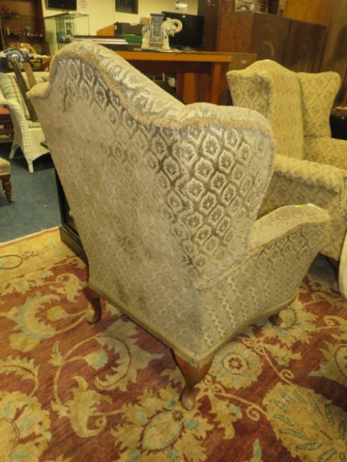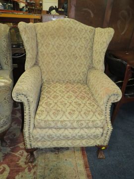 A VINTAGE WING - BACK ARMCHAIR WITH BALL AND CLAW FEET - A/F