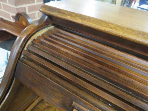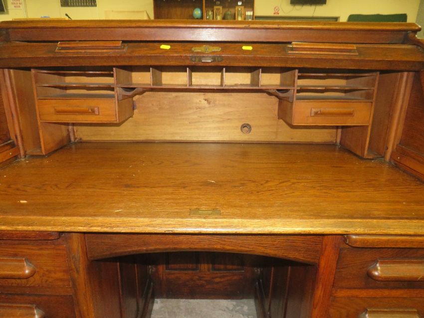 AN EARLY 20TH CENTURY OAK 'S' TAMBOUR ROLL TOP DESK
