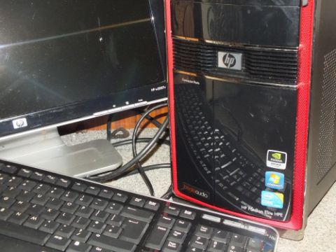 A HP PAVILION ELITE HPE SERIES COMPUTER WITH MONITOR AND KEYBOARD