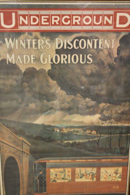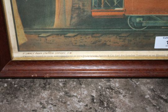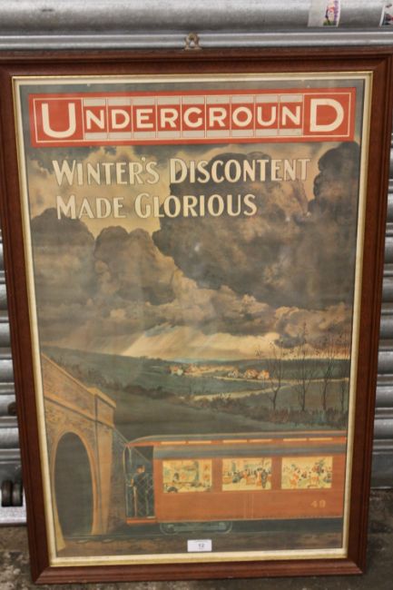 A REPRODUCTION FRAMED AND GLAZED LONDON RAILWAY INTEREST PRINT ENTITLED 'UNDERGROUND WINTERS DISCONTENT MADE GLORIOUS' - OVERALL SIZE INCLUDING FRAME 84CM X 54.5CM