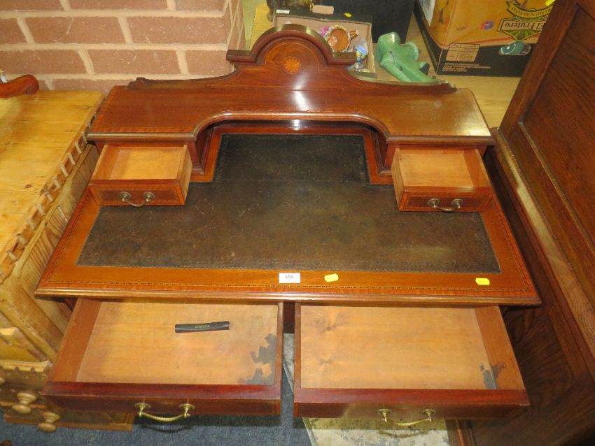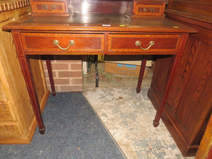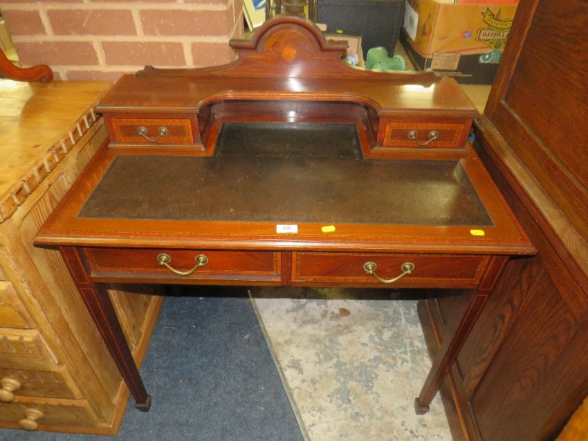 AN EDWARDIAN MAHOGANY INLAID LEATHER TOP LADIES DESK H-99 W-92 CM
