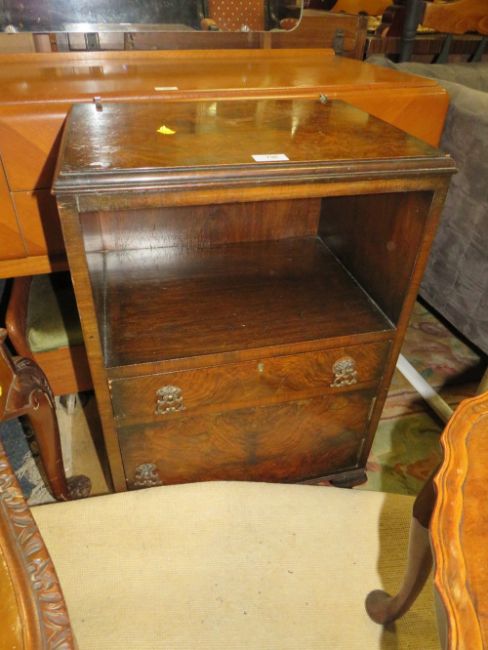 A VINTAGE WALNUT BEDSIDE CABINET, WALNUT COFFEE TABLE AND A CIRCULAR COFFEE TABLE (3)