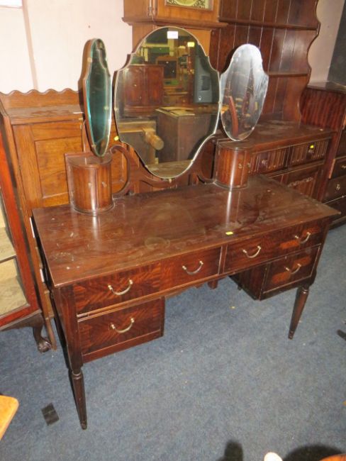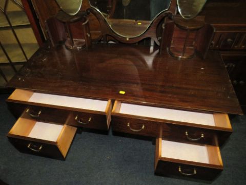 A REPRODUCTION MAHOGANY DRESSING TABLE WITH SHEILD SHAPED MIRRORS W-114 CM