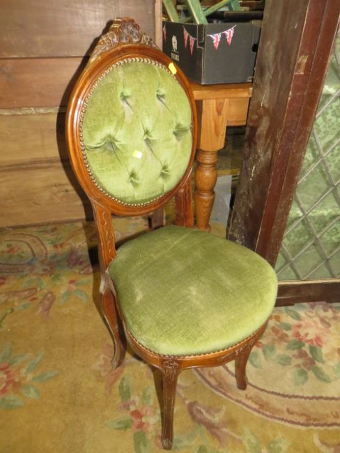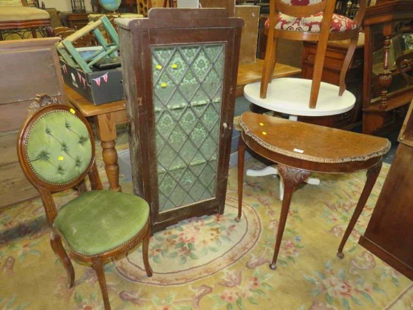 A WALNUT DEMI-LUNE TABLE, BEDROOM CHAIR AND A GLAZED CABINET (3)