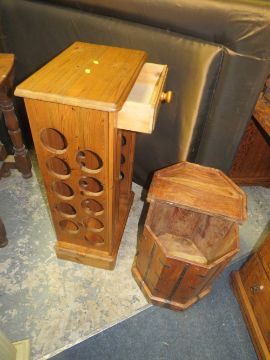 A COLONIAL STYLE HARDWOOD BOUND LIDDED OCTAGONAL BOX H-45 CM AND A PINE WINE RACK (2)