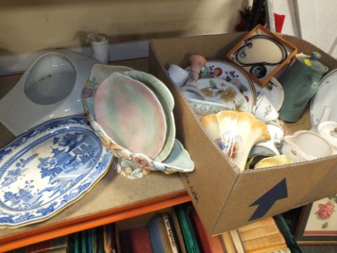 A BOX OF ASSORTED CERAMICS TO INCLUDE CROWN DEVON, BESWICK VASE ETC.