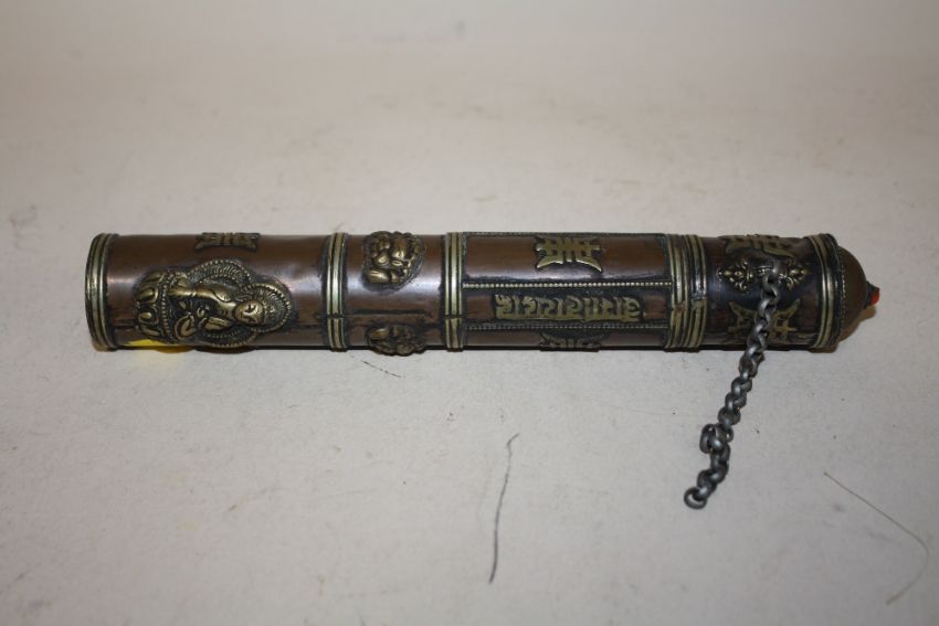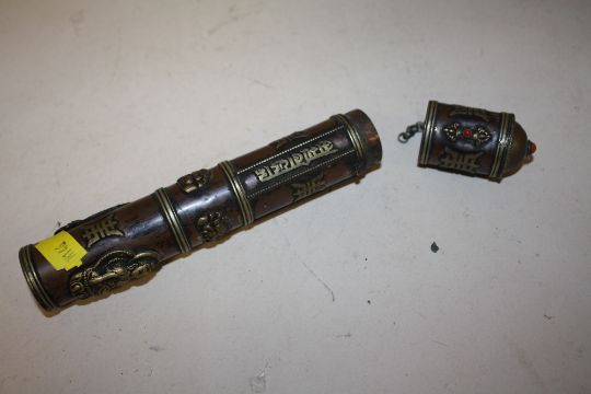 AN ORIENTAL COPPER AND BRASS SCROLL HOLDER