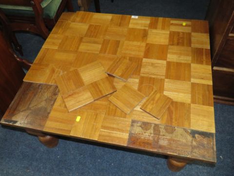 AN UNUSUAL LOW OAK COFFEE TABLE WITH APPLIED PARQUET STYLE TILES - SOME LOOSE H-38 W-84 CM