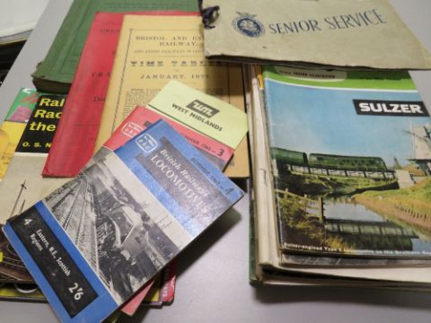 A COLLECTION OF RAILWAY INTEREST BOOKS AND MAGAZINES TO INCLUDE BRITISH RAILWAYS LMR DERBY 1960 RULES AND REGS / WORKING TIMETABLE HANDBOOK, VARIOUS 1960S COPIES OF MODERN RAILWAYS AND A SENIOR SERVICE SET OF BRITISH RAILWAYS PHOTOGRAPHIC CARDS CONTAINED IN AN ALBUM (APPROX 29)