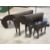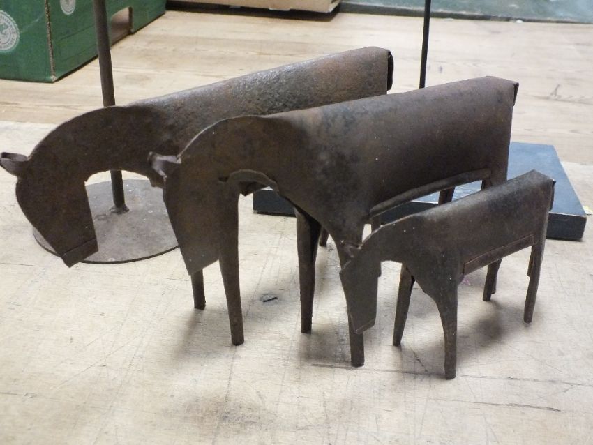 A TRIO OF METAL COWS TOGETHER WITH TWO METAL CHICKENS