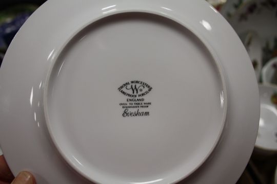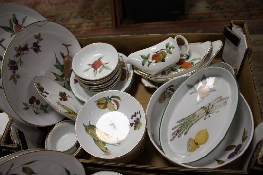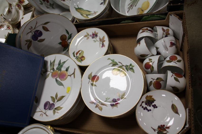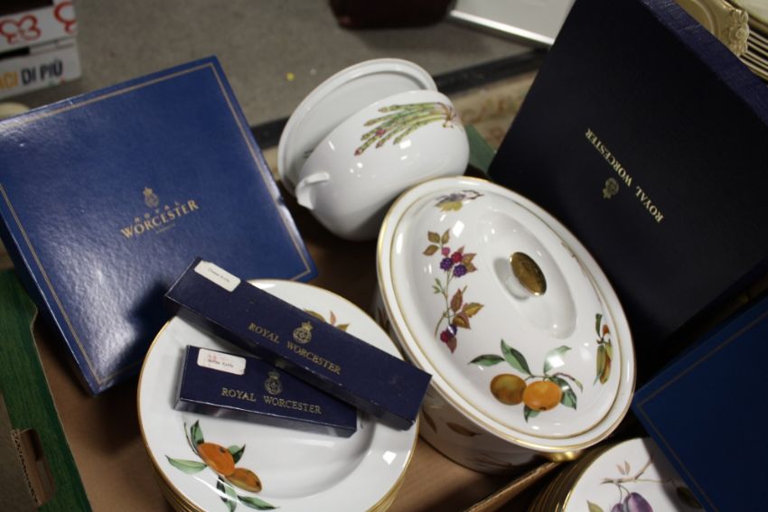 THREE TRAYS OF ROYAL WORCESTER EVESHAM CHINA TO INCLUDE A OVAL LIDDED COOKING POT, DINING PLATES ETC.