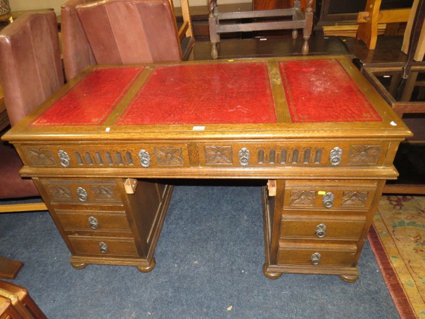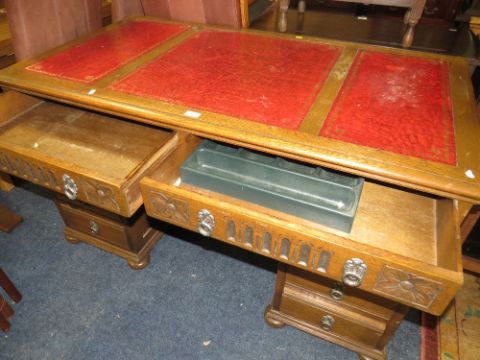 AN 'OLD CHARM' STYLE CARVED OAK LEATHER TOPPED TWIN PEDESTAL DESK H-79 W-138 CM