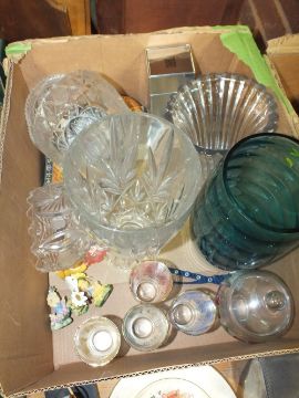 TWO TRAYS OF ASSORTED CERAMICS AND FIGURES TO INCLUDE COLLECTORS PLATES, TOGETHER WITH A TRAY OF GLASSWARE TO INCLUDE A BOHEMIA CRYSTAL LUSTER