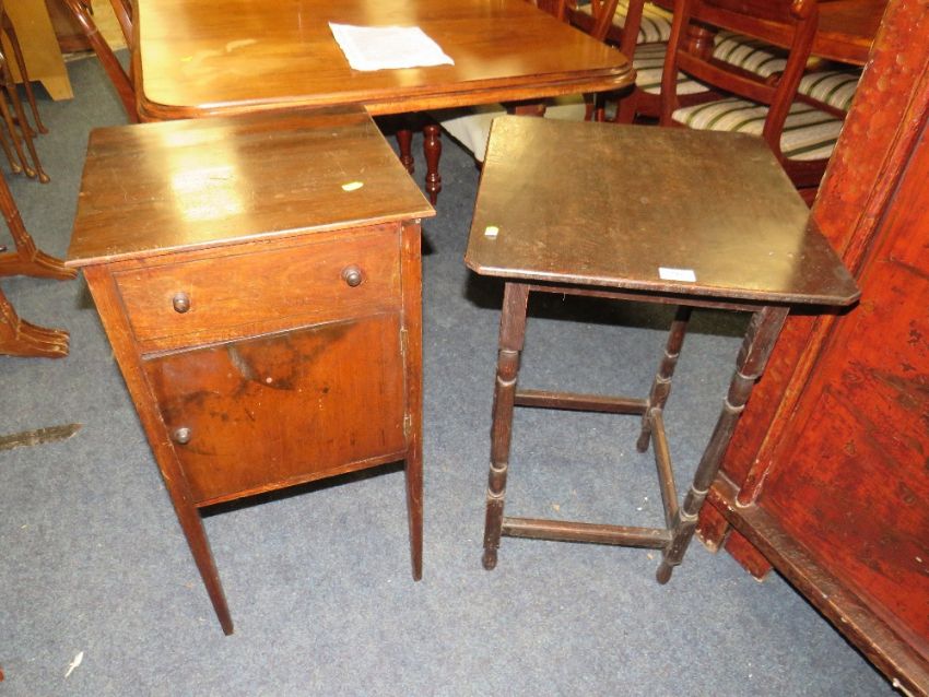 A VINTAGE OAK OCCASIONAL TABLE AND A POT CUPBOARD (2)