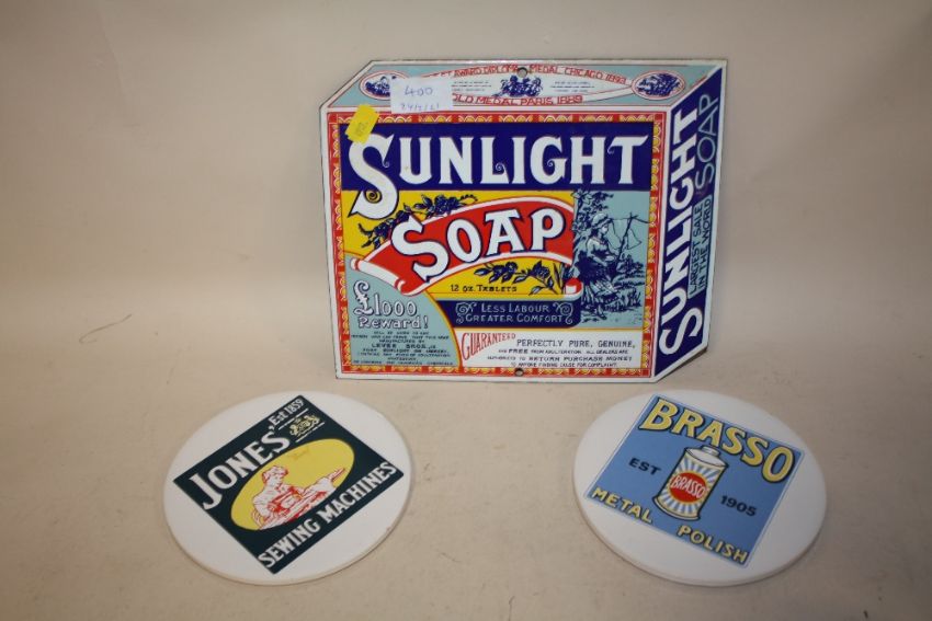 A REPRODUCTION ENAMEL ADVERTISING SIGN FOR SUNLIGHT SOAP TOGETHER WITH TWO CERAMIC ADVERTISING COASTERS