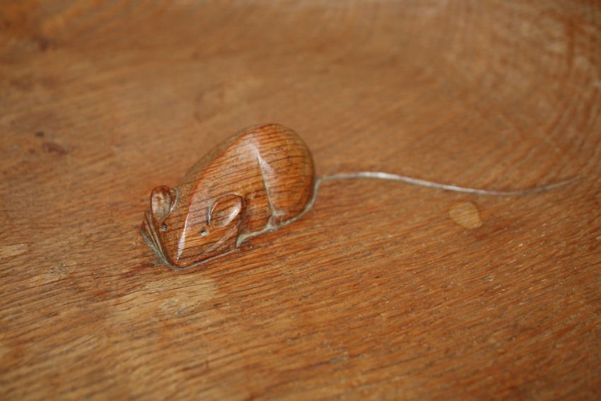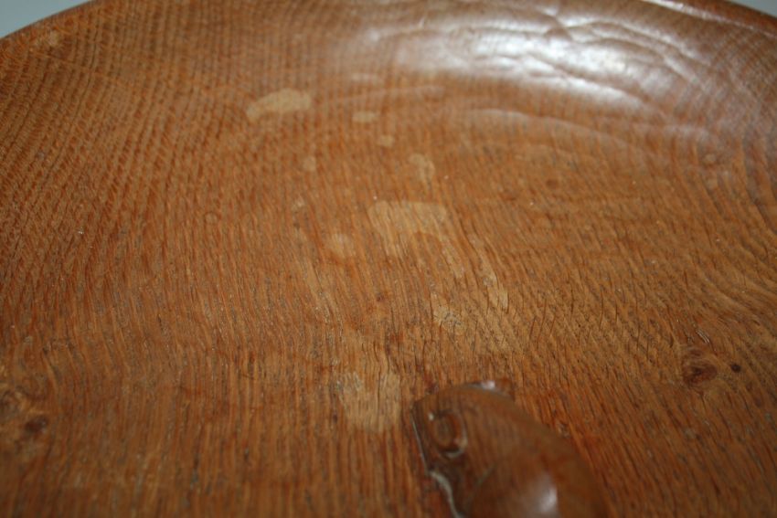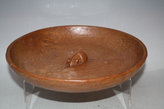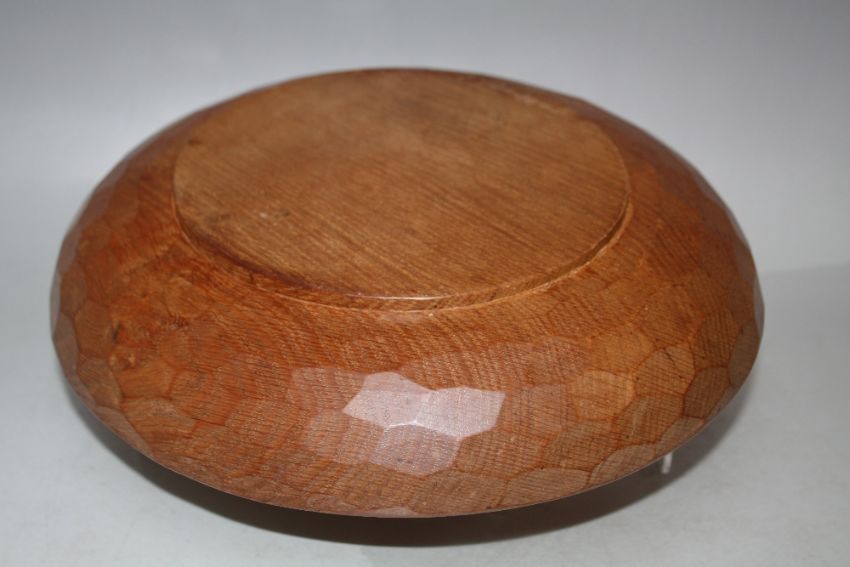 A ROBERT THOMPSON OF KILBURN MOUSEMAN LARGE OAK LOW SHALLOW BOWL, adzed inside and out, with signature carved mouse to the centre, Dia. 29.8 cm
