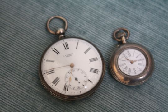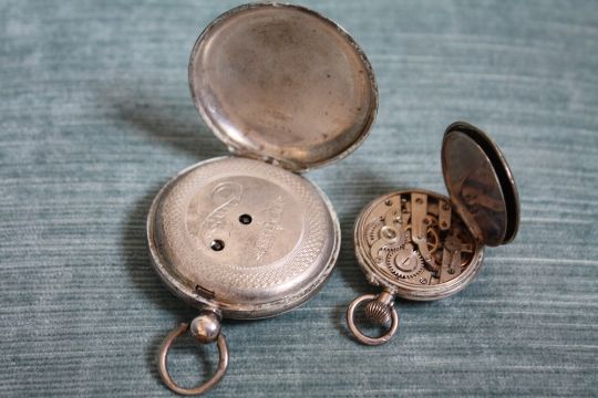 A SILVER OPEN FACED MANUAL WIND POCKET WATCH, Dia 4.5 cm together with a small silver fob watch (2)