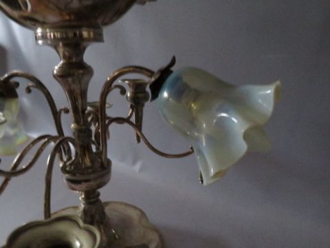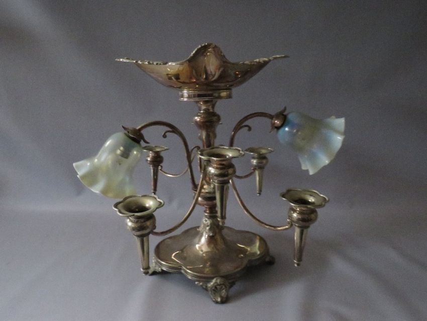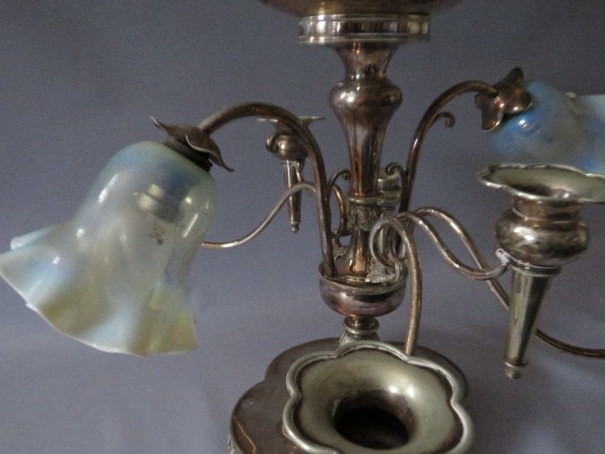 AN EDWARDIAN SILVER PLATED SIX BRANCH EPERGNE TABLE CENTRE / LAMP, the two light fittings with vaseline glass shades, the epergne with shaped bowl surmount, marked to the base for Thom Latham / Ernest Morton of Birmingham, circa 1897, W 48 cm, W 53 cm