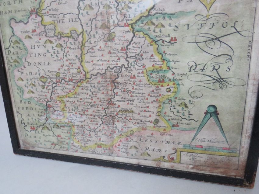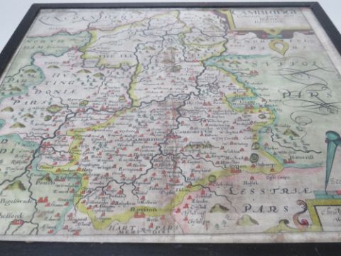 AN ANTIQUE HAND COLOURED SAXON- KIP MAP OF CAMBRIDGE c.1637, framed and glazed, 32 x 36 cm