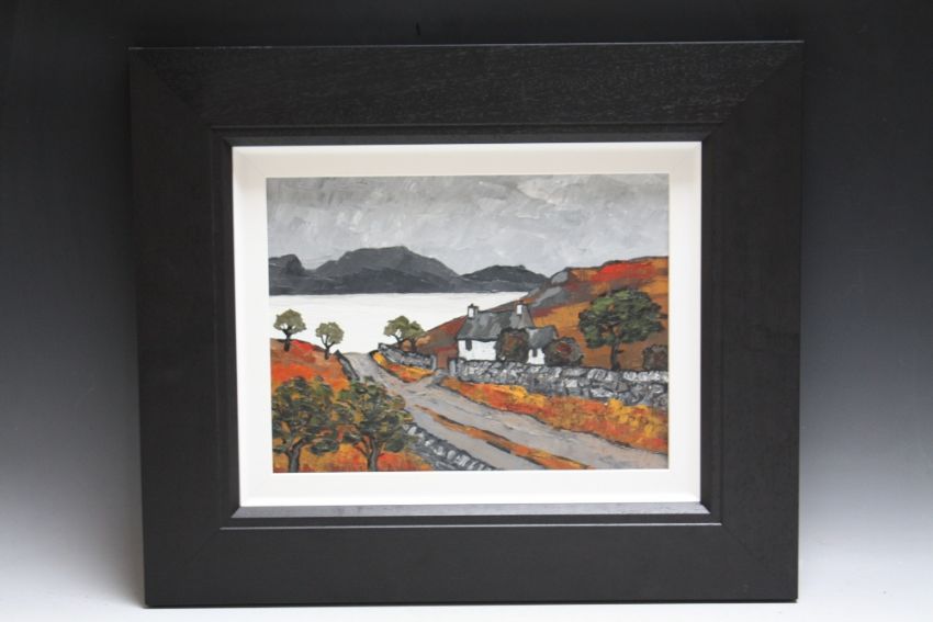 DAVIS BARNES (XX-XXI). Welsh school, stormy mountainous coastal scene with cottage 'Near Lake Ogwen', signed verso, oil on board, framed, 29 x 39 cm