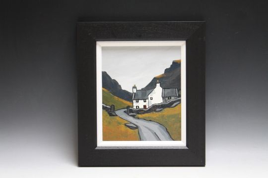 DAVIS BARNES (XX-XXI). Welsh school, mountainous landscape with cottage by road 'At The Head of The Pass' signed verso, oil on board, framed 29 x 24 cm