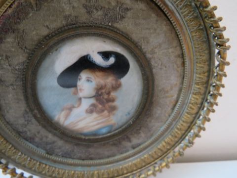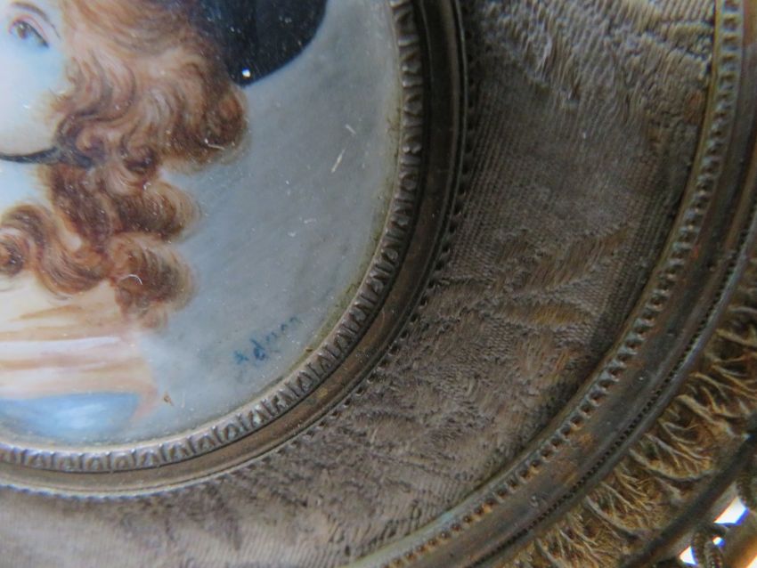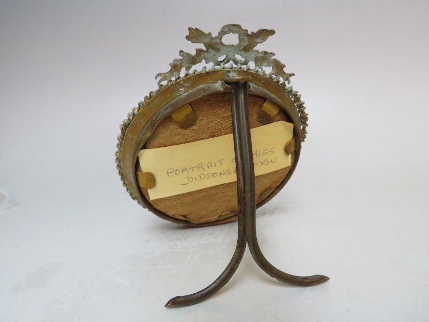 A DIXON (XIX). A circular portrait miniature on ivory of Miss Diddons (see note verso), signed middle to lower right, framed in circular decorative brass frame with strut back, Dia. 4 cm