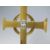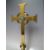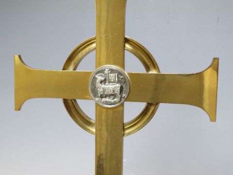 A BRASS CHURCH ALTAR CRUCIFIX, of classic geometric form, raised on circular base, with white metal 'Lamb of God' medallion to centre, H 47 cm