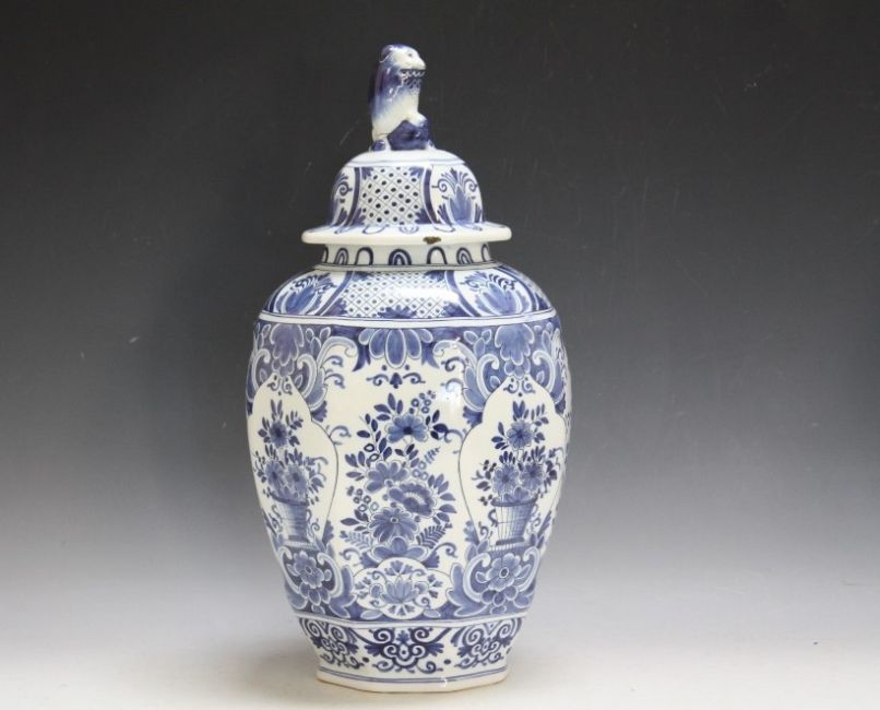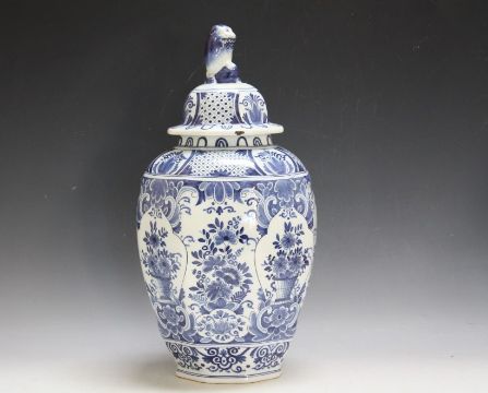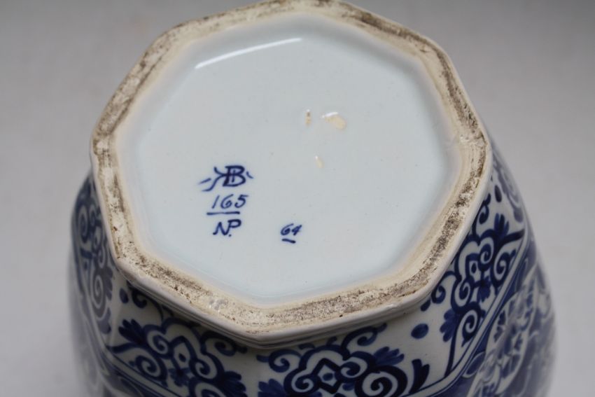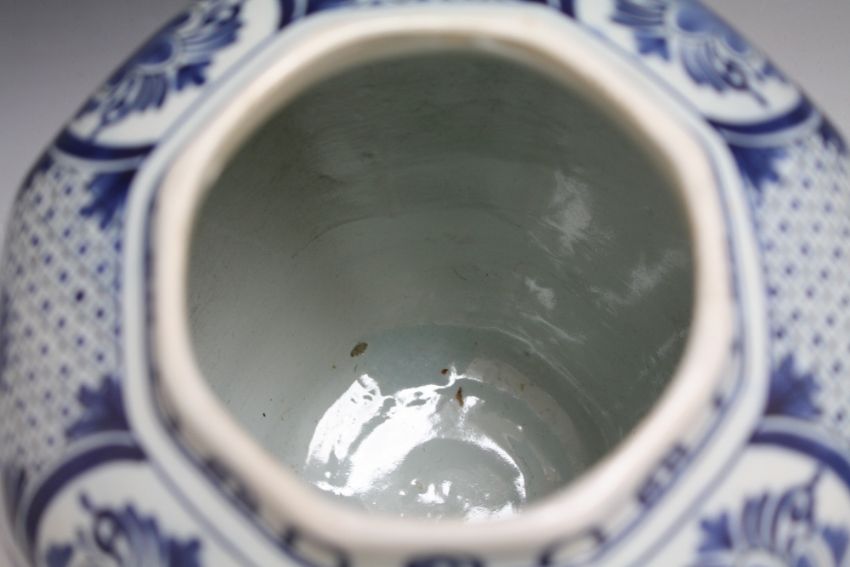 AN OCTAGONAL BLUE AND WHITE TEMPLE JAR AND COVER, A/F, H 43.5 cm
