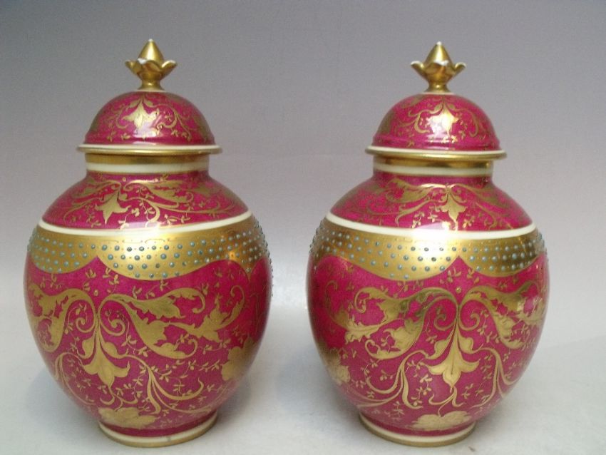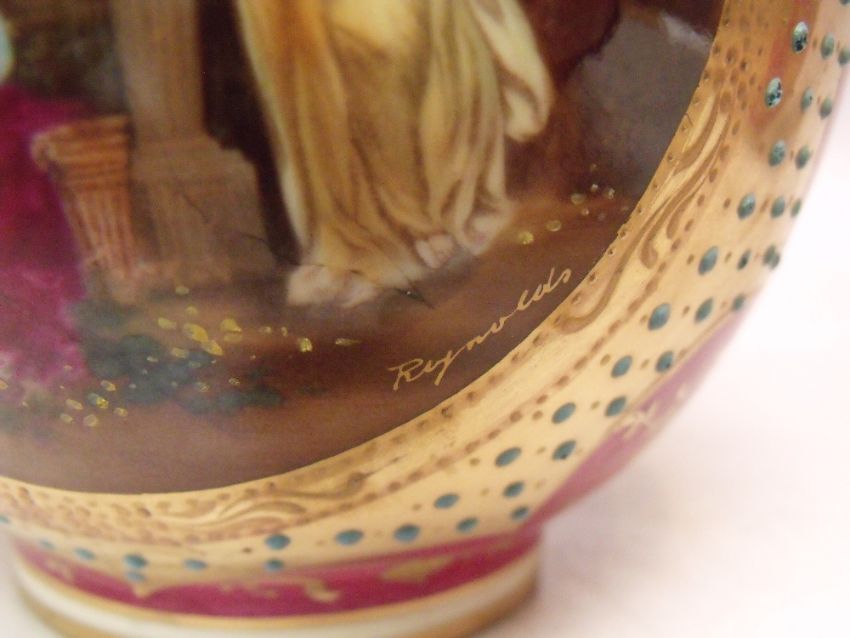 A PAIR OF ROYAL VIENNA GILDED PORCELAIN LIDDED VASES, each with blue beehive mark and titled in red - Decorating Hymen / Young Bacchus, both with signature to bottom edge of panel, beehive marks to base, H 23 cm (2)