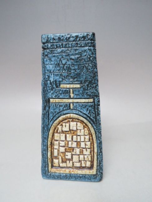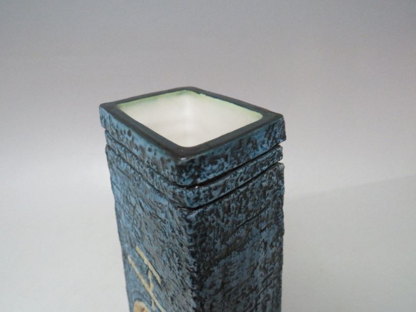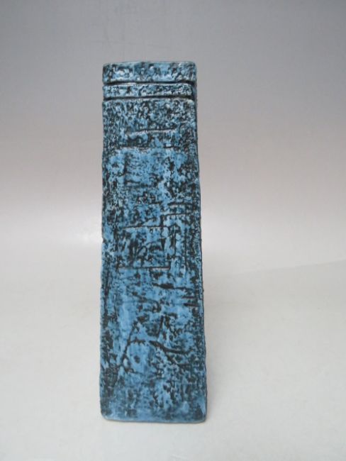 A TROIKA POTTERY 'COFFIN' VASE, of tapering form, textured blue ground with decorative panel to front and back, hand painted 'Troika' and artist's monogram to base (Alison Brigden (AB) - 1977 to 1983), H 14.3 cm