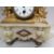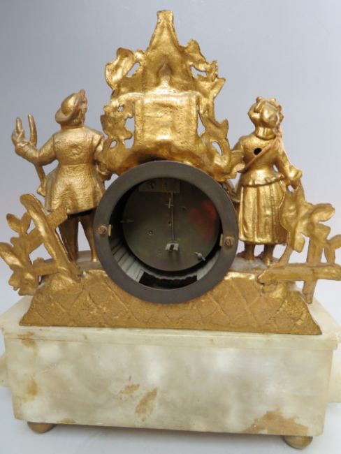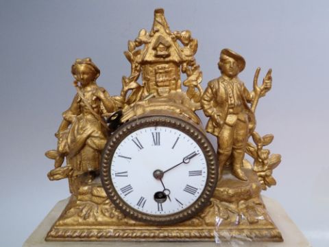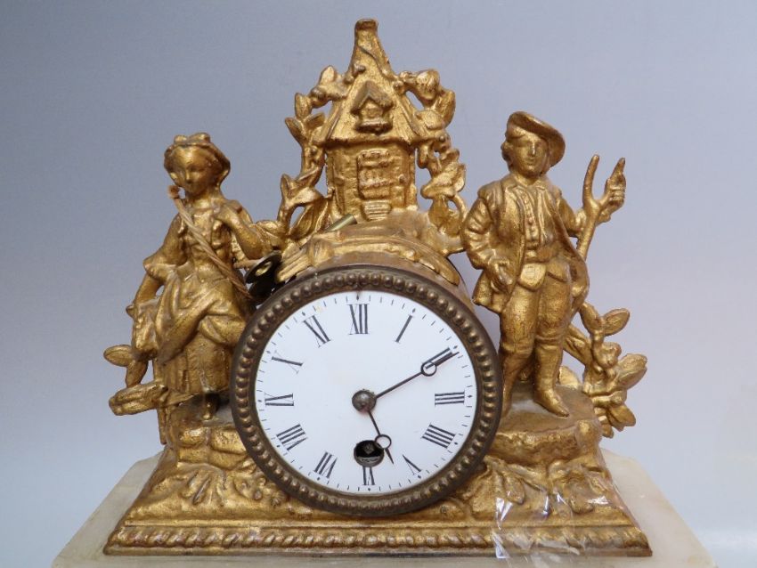 A FRENCH GILT SPELTER AND ALABASTER FIGURAL CLOCK, enamel dial with Roman numerals, single train movement stamped 503, with pendulum, W 31 cm, H 30 cm