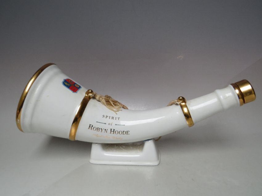 A WADE SPIRIT OF ROBYN HOODE WHISKY DECANTER IN THE FORM OF A HUNTING HORN WITH STAND, L 36 cm