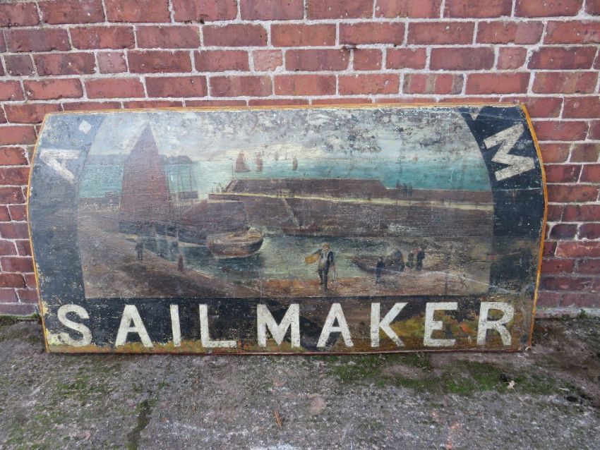 A LARGE VINTAGE WOODEN HANDPAINTED 'SAILMAKER' SIGN A/F, the remaining part of the sign depicting a harbour scene with fishermen, figures and boats, approximate W 206 cm, H 101 cm, D 5.5 cm, D 5.5 cm