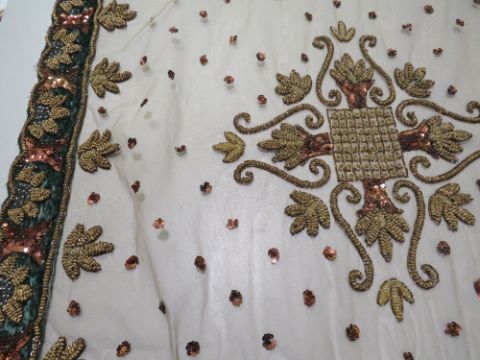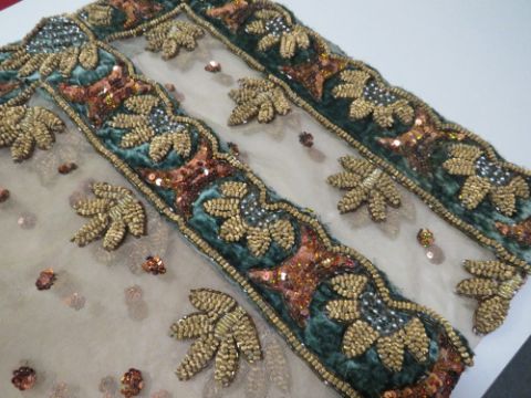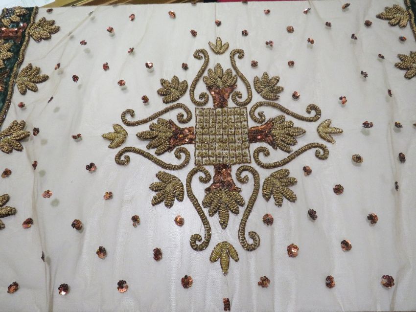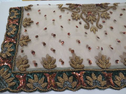 A HEAVILY EMBELLISHED DECORATIVE TABLE COVER, scalloped edge to velvet border with profuse sequinned and metallic thread design, similar embellishment to central mesh panel, 96 x 96 cm