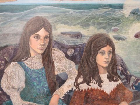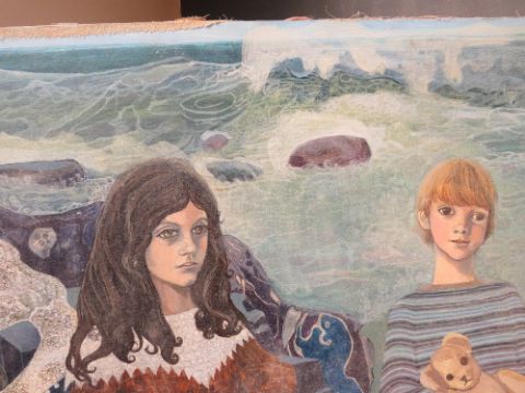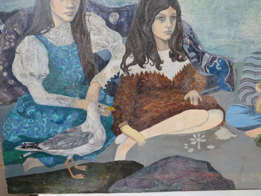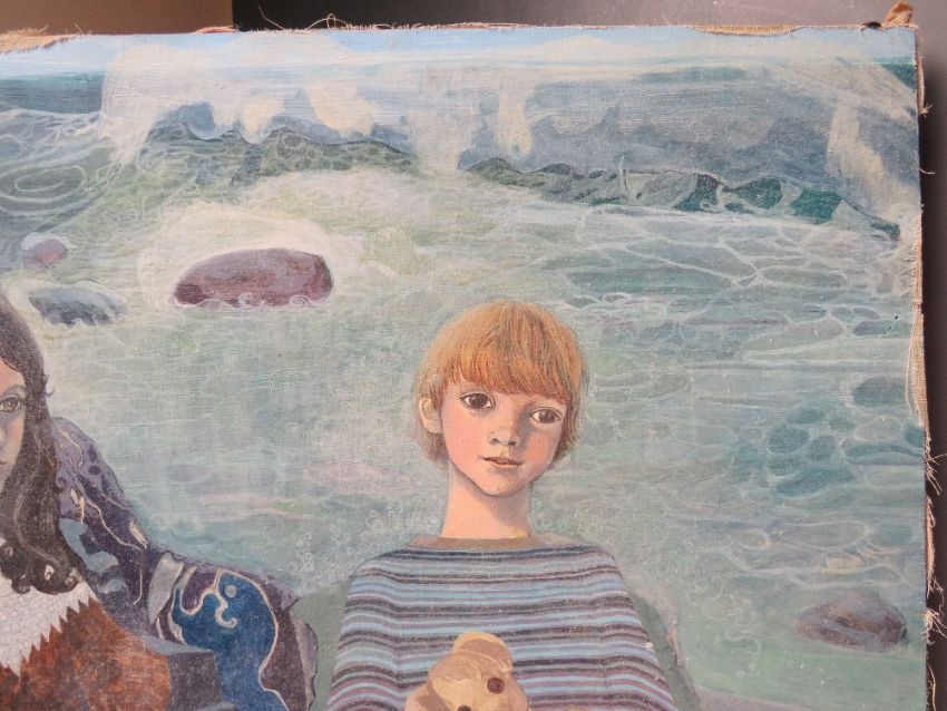 ANNE JOHNSON (XX) British school, rocky beach scene with three children, unsigned, oil on canvas laid on board, unframed, 55 x 81 cm